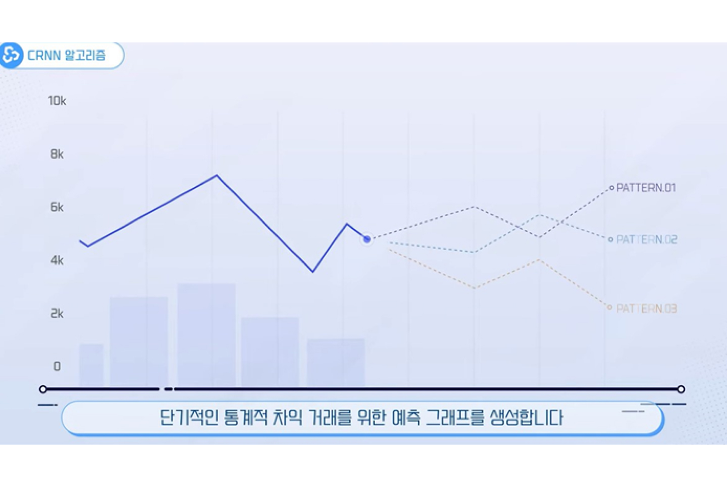 과거의 시세 차트를 이미지화하여 CRNN 알고리즘을 통해 시세 변동성을 인식하며, 머신러닝으로 도출된 투자 패턴을 적용하여 단기적인 통계적 차익 거래를 위한 예측 그래프 생성