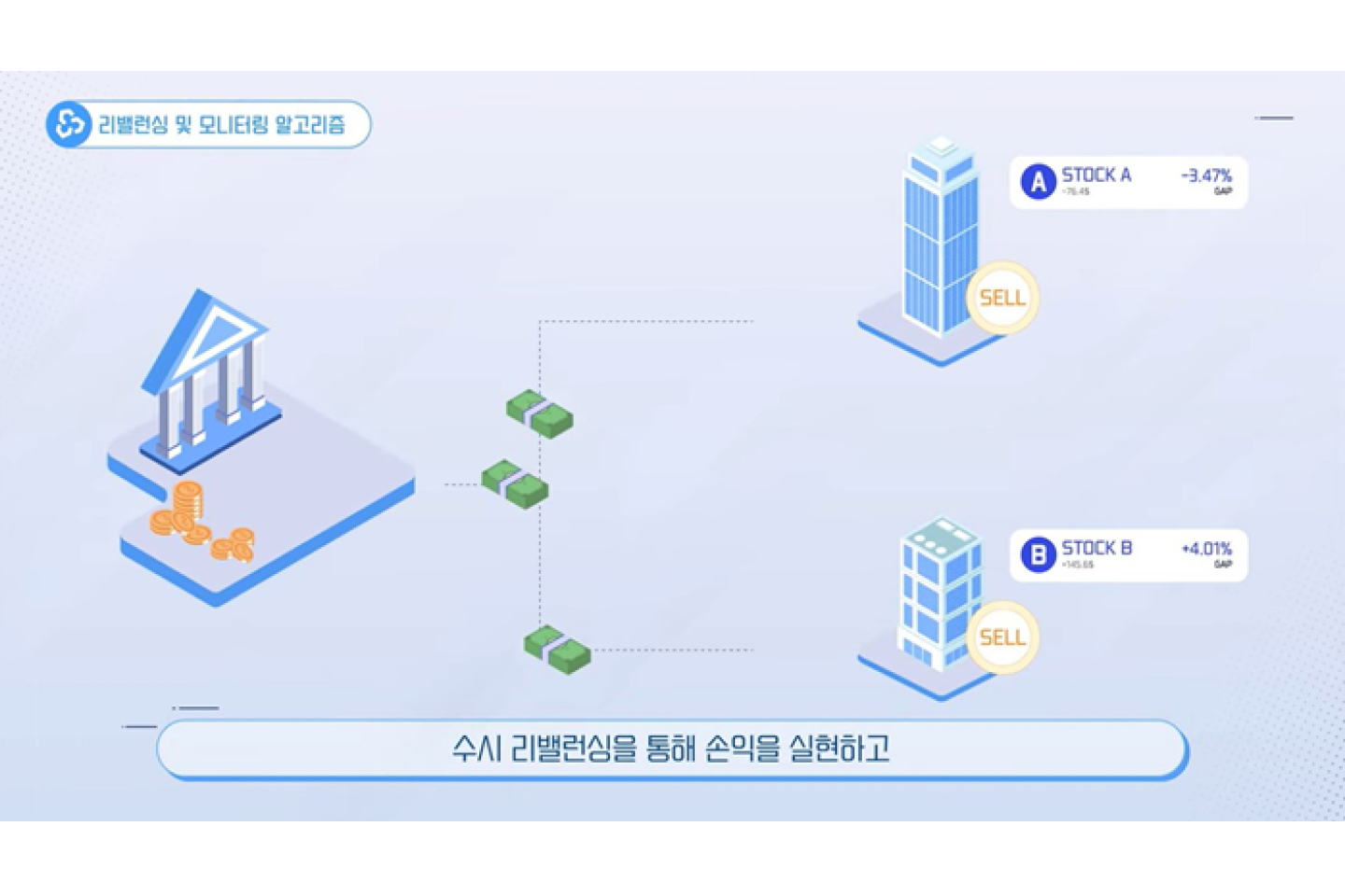 실시간 모니터링을 하여 예측과 갭이 발생하면 수시 리밸런싱을 통해 손익을 실현하고 예측이 실패한 경우 오류 검출과 재학습을 통해 투자 패턴 개선